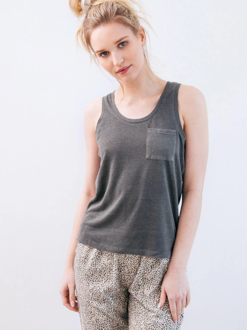 This classic burnout tank is perfect to throw on with any of your favorite bottoms! Super comfy and relaxed fit, featuring a scoop neck and small front pocket detail.Â