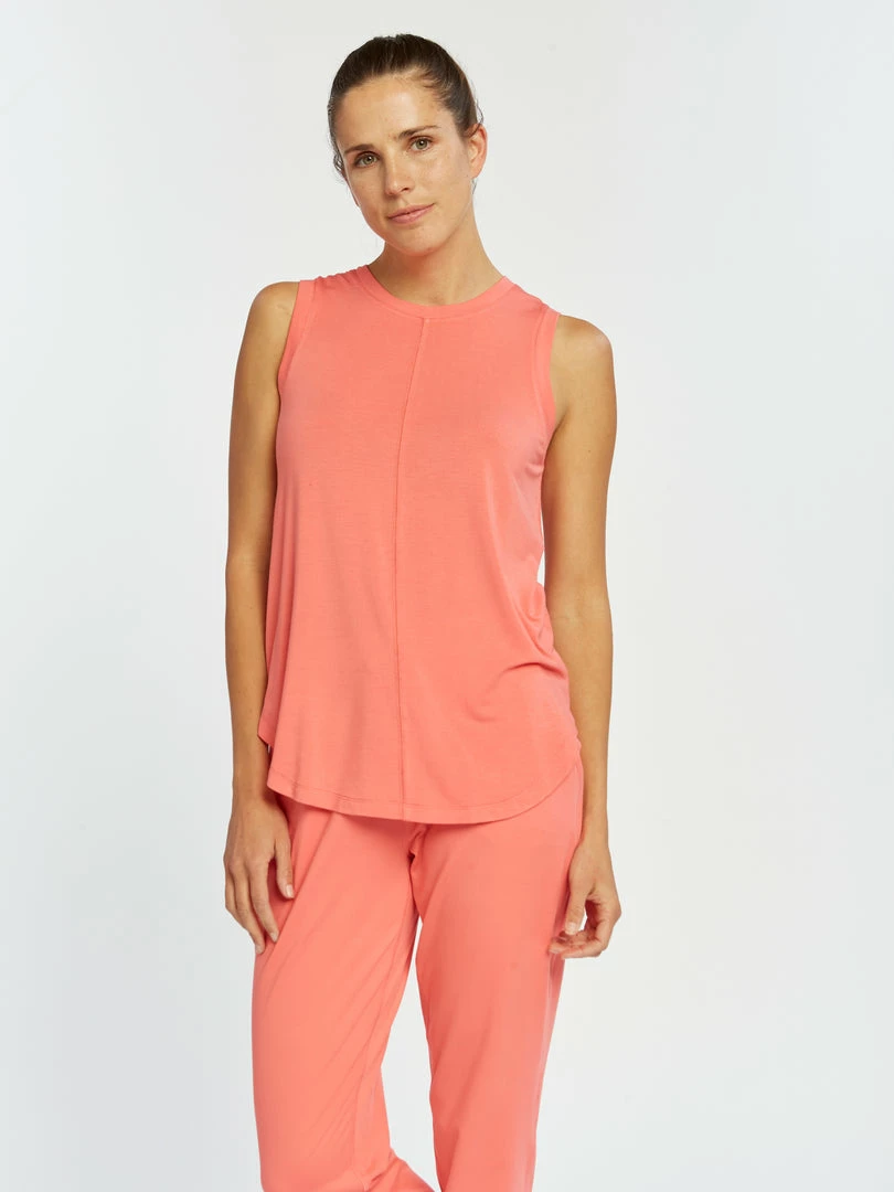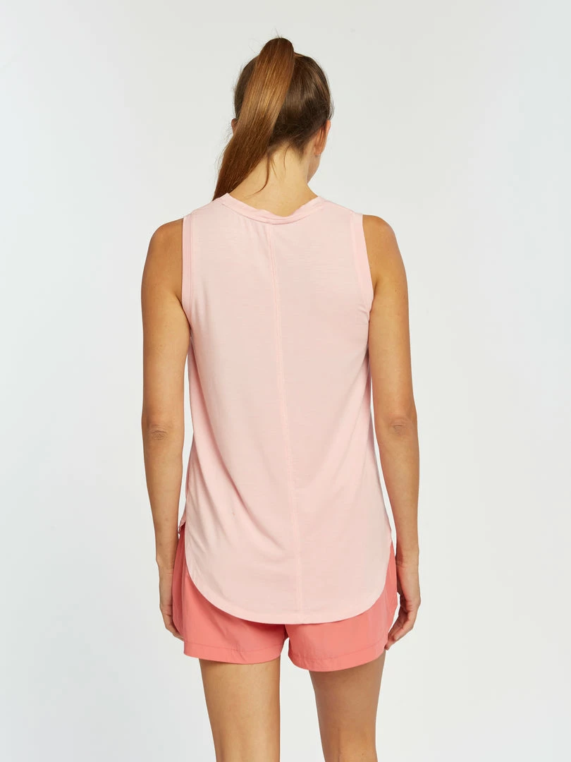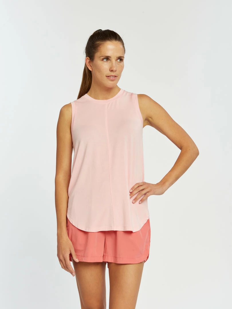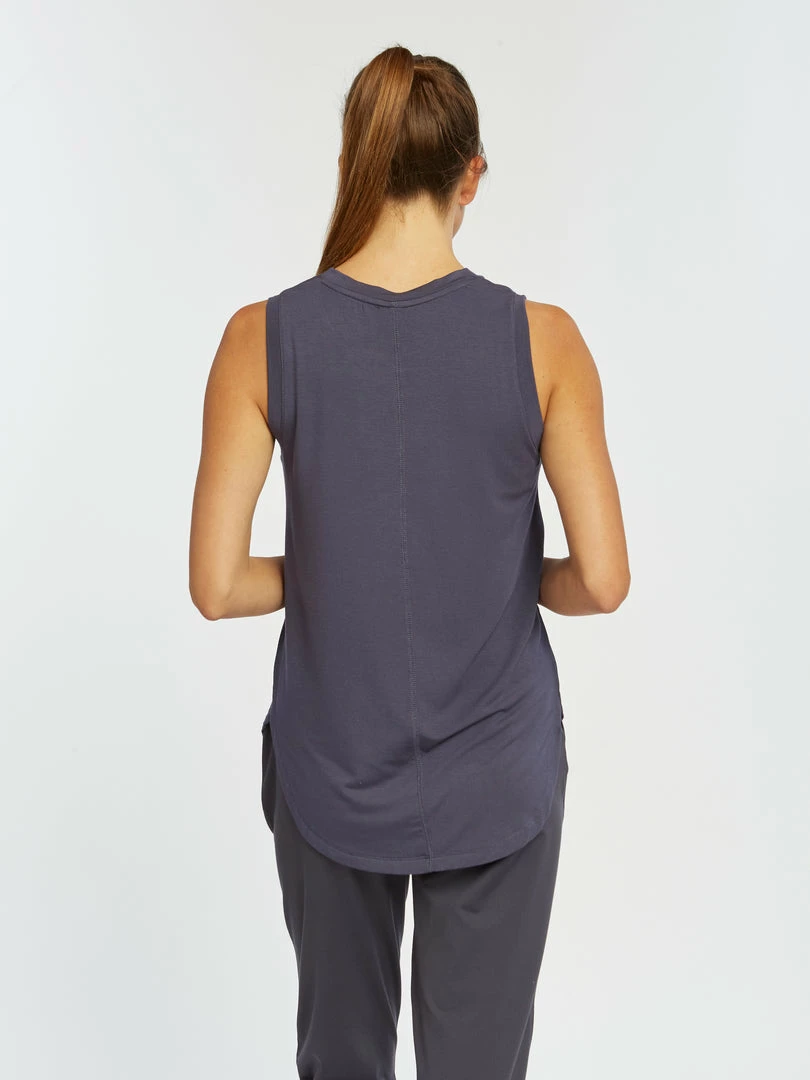An easy exercise or every day essential, this flowy lightweight tank is featured in a shirt tail hem design with a high neck. Throw on post workout or wear around for ultimate comfort.