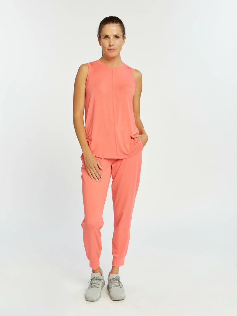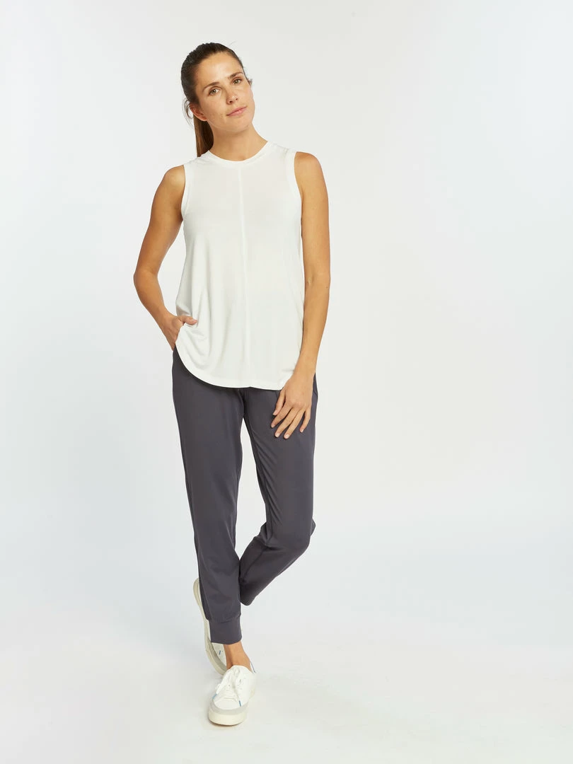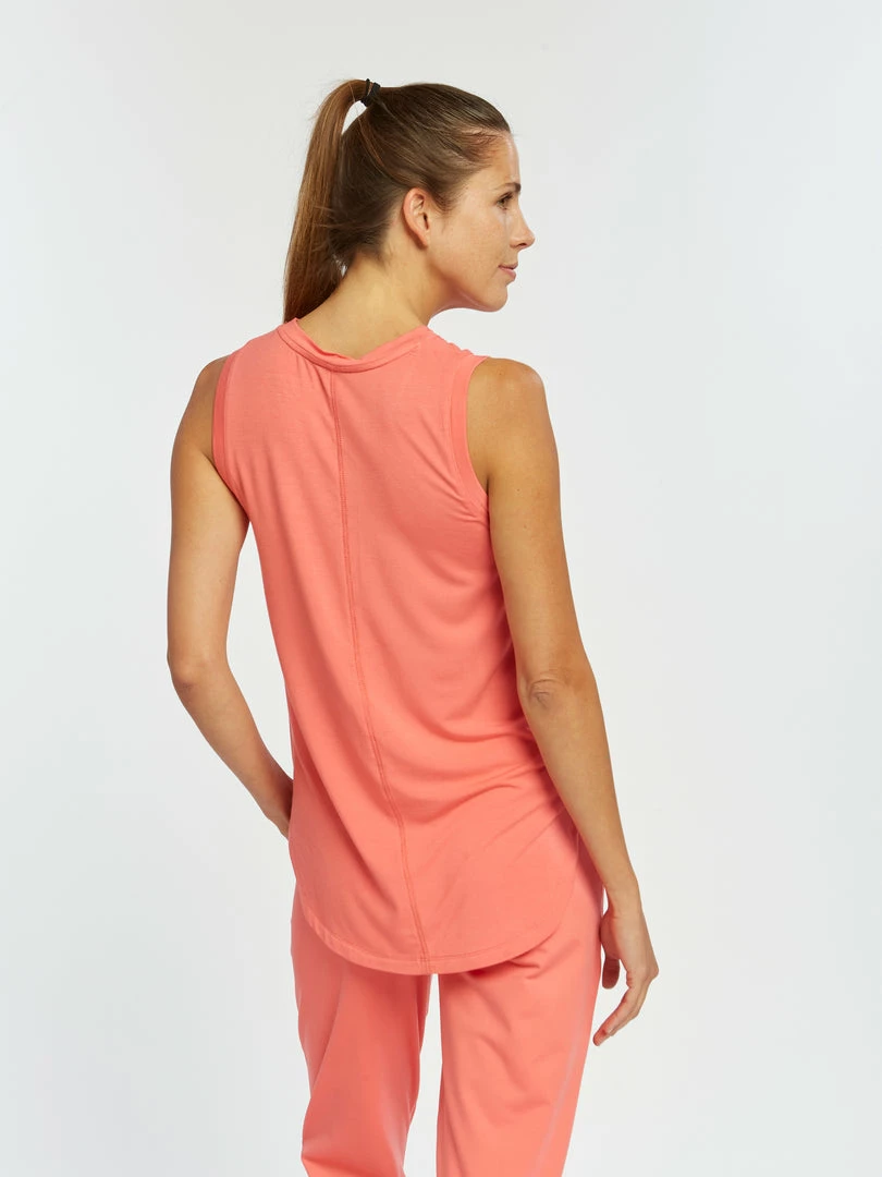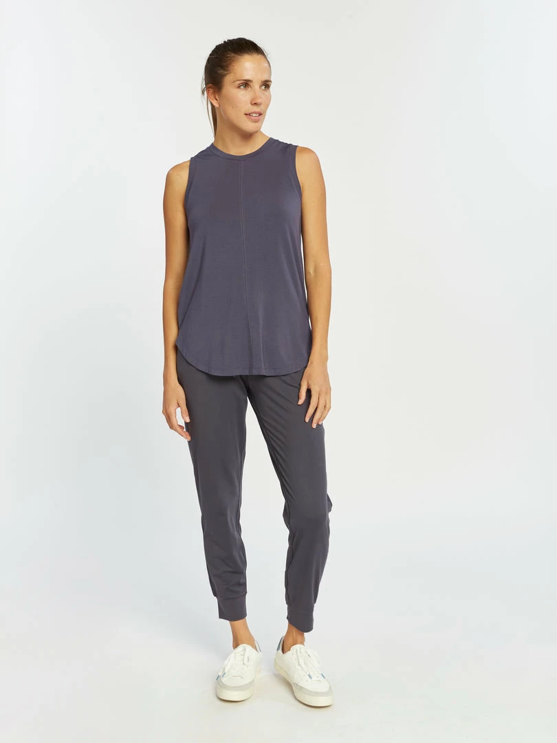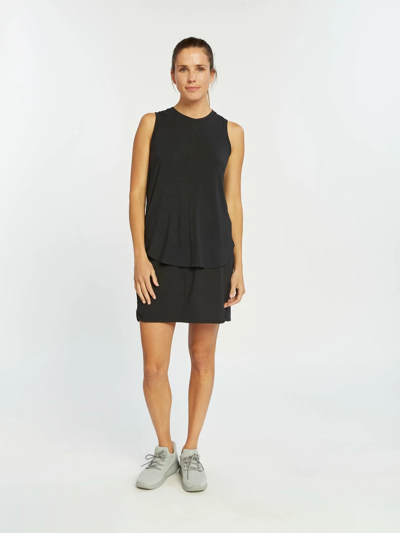 An easy exercise or every day essential, this flowy lightweight tank is featured in a shirt tail hem design with a high neck. Throw on post workout or wear around for ultimate comfort.