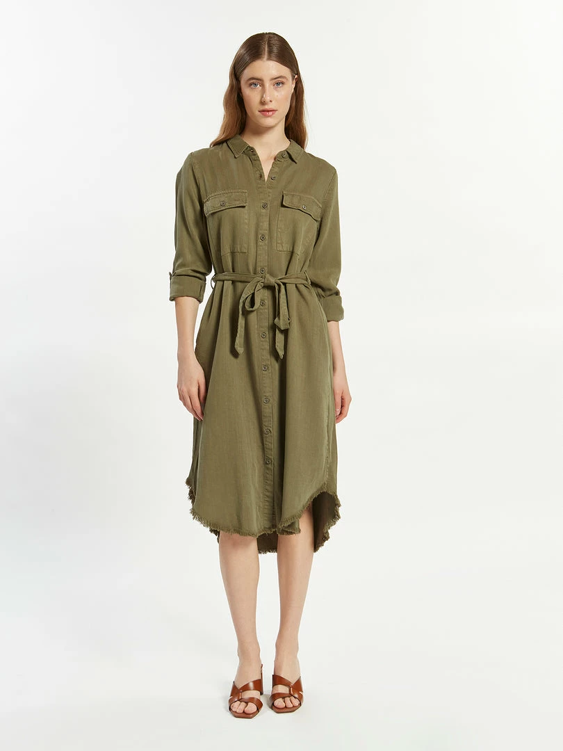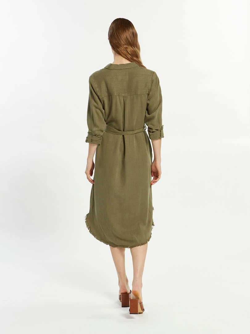 Taking the button up dress up a notch, this so cool tailored version is featured in a button-front silhouette with a frayed hem and defined waist at belt for added shape.