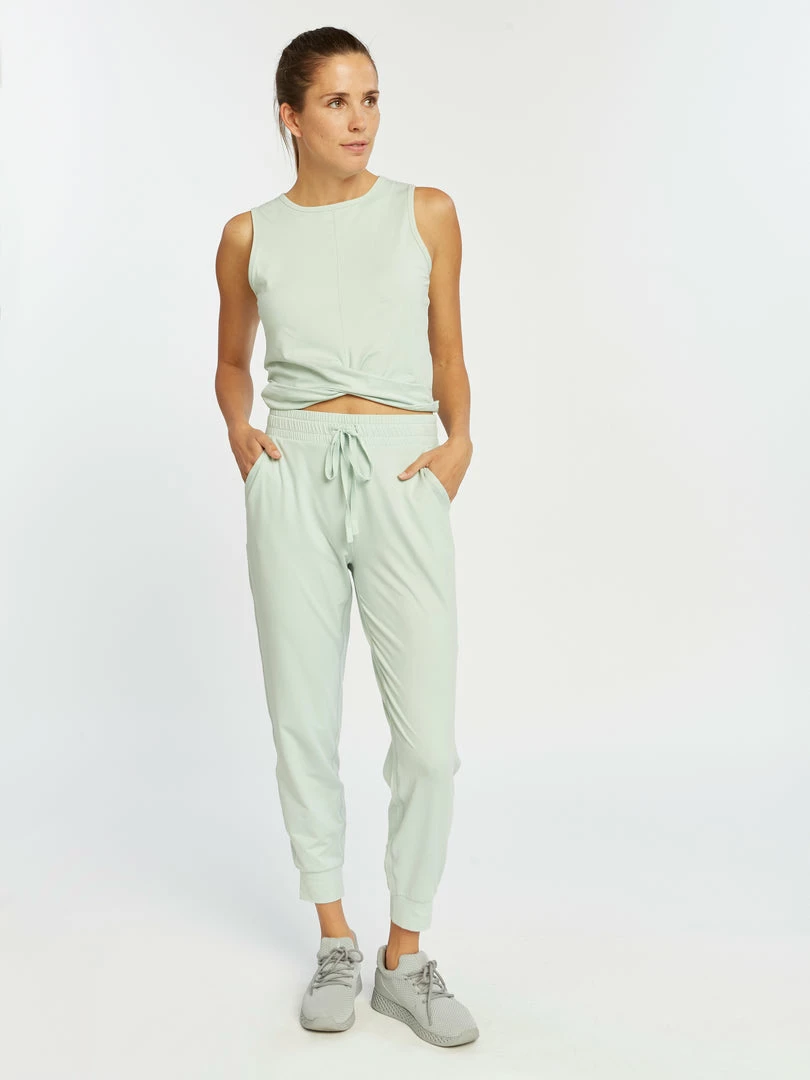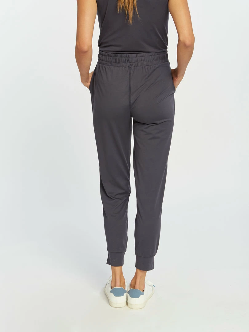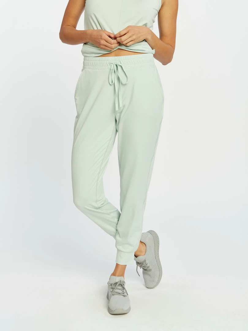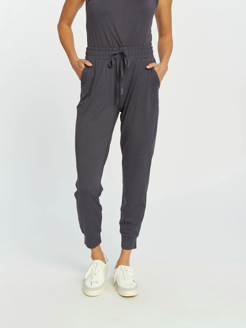 Stay comfy in the Junie Jogger! Whether you are post yoga session or lounging out, these pants are perfect for any activity. Featuring elastic waist band with drawstring tie, 2 front pockets and a pull on fit.