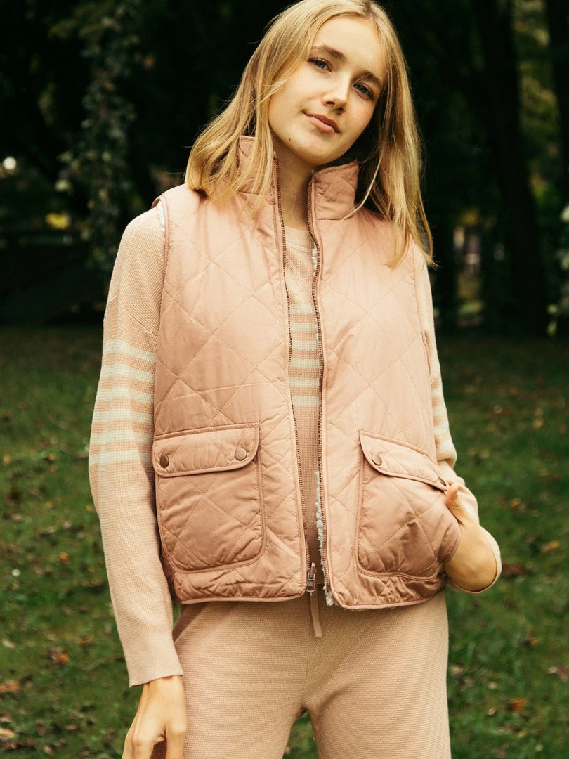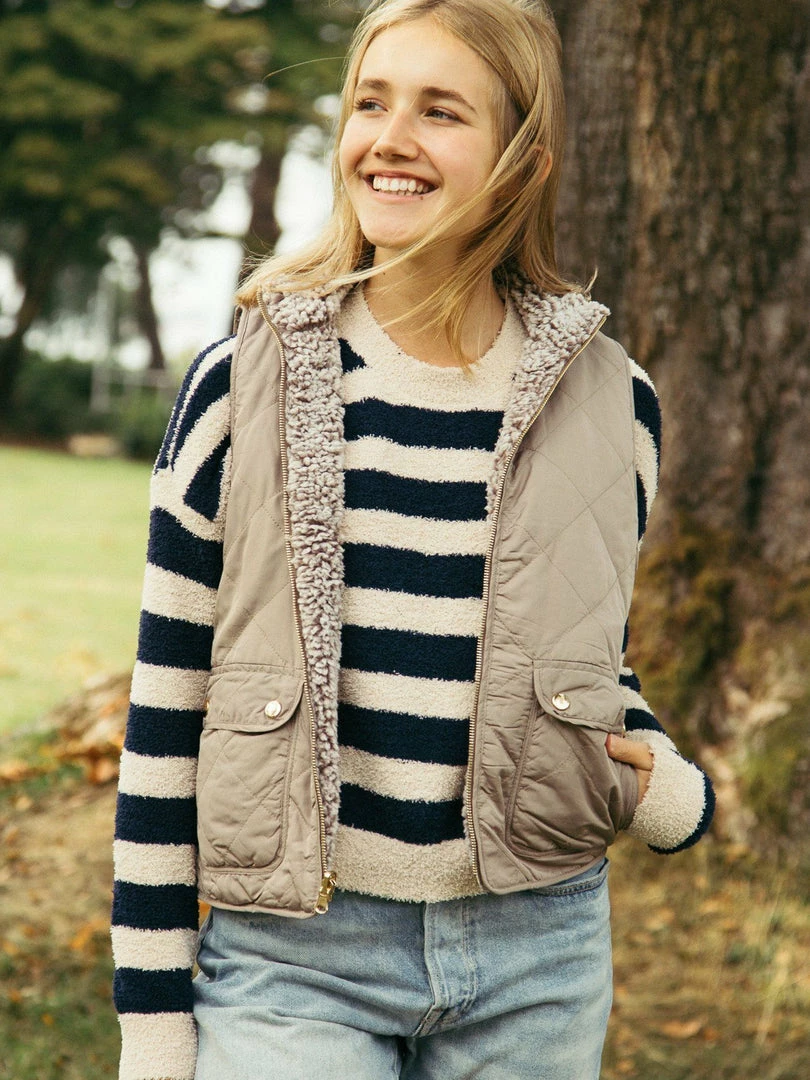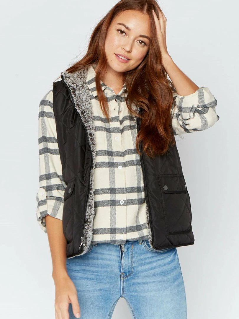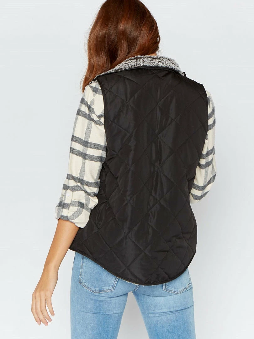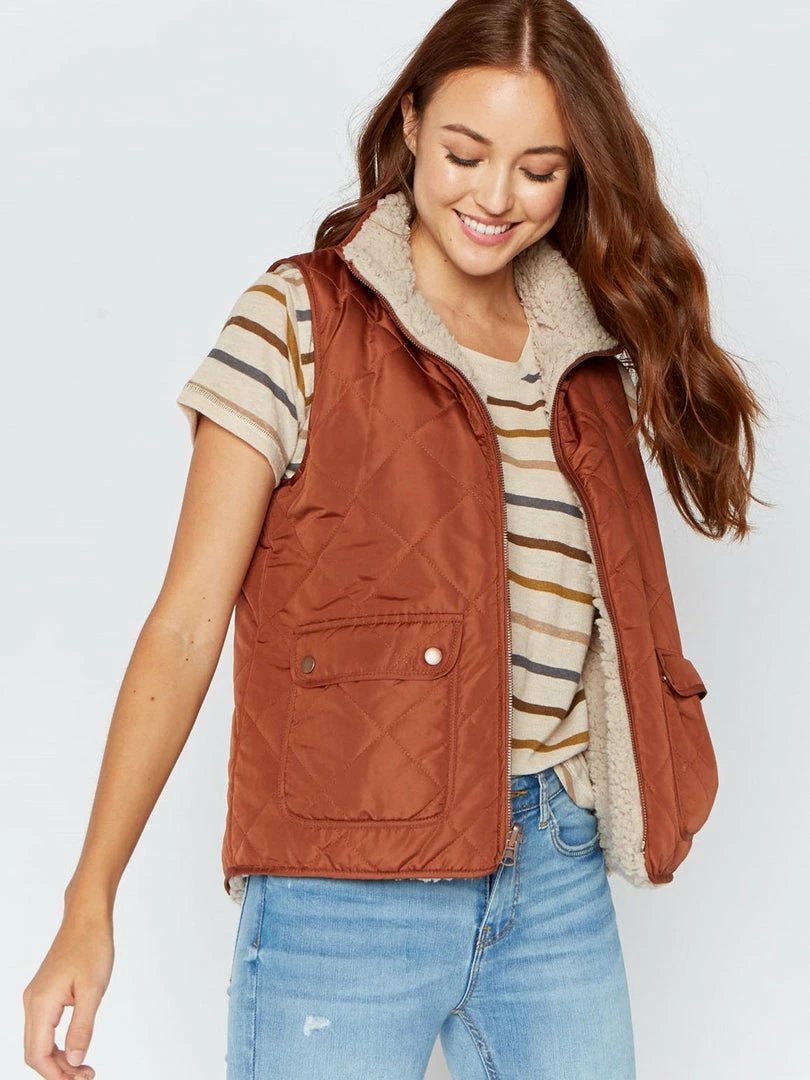 Soft and cozy quilted puffer vest, reversible with a Sherpa lining for two different looks. Features front pockets and a zip front closure. Perfect transition from Summer to Fall over a fuzzy sweater or your favorite button up!