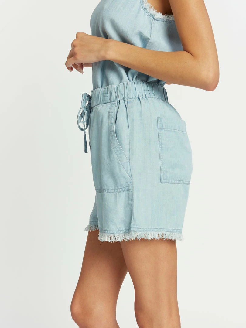 Effortless and femme, these perfectly distressed high-rise denim shorts feature a drawstring waistband and side pockets. Perfectly paired with our Haven Top or your favorite tee.