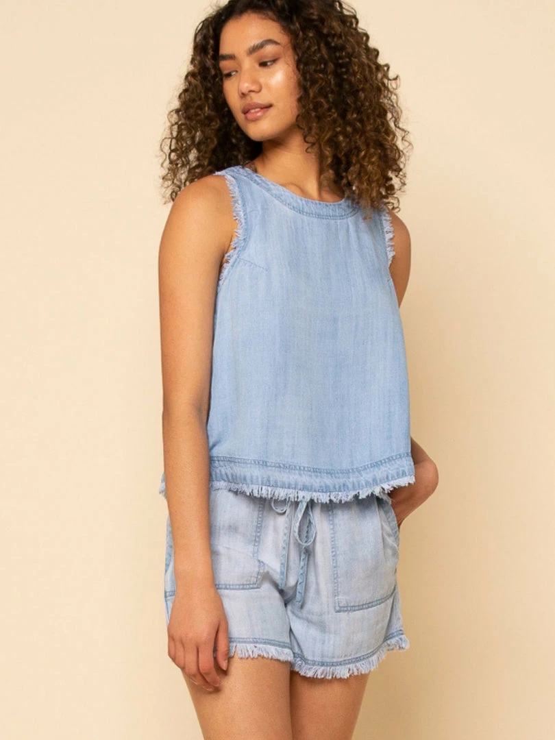 This super soft, relaxed fit tank is a perfect addition for your closet. Made to be worn with the Haven Shorts for the perfect match. Featuring a frayed hem, high neck and back button detailing.Â